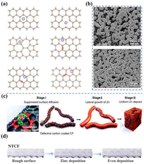 Alternatively, Lu et al. demonstrated that constructing nitrogen-rich defects on carbon felts is also an effective strategy to achieve uniform Zn deposition [42]. In the study, their density functional theory calculations reveal that the defects loaded with pyridine- and pyrrole-N present strong adsorption of Zn atoms. During the charging process, reduced Zn atoms are preferentially deposited in the defects, leading to the uniform Zn deposition on the fiber surface (Figure 3d). It is shown that the ZFB with rich N-containing functional groups delivers a Coulombic efficiency of 97.25% at an ultra-high current density of 180 mA cm−2. Furthermore, the Zn symmetry flow battery exhibits a long cycle of over 140 times at an area capacity of 40 mAh cm−2 and a current density of 80 mA cm−2. It is worth noting that the introduction of defects may also alter the surface roughness (specific surface area), hydrophobicity, and electrical conductivity. The improvement in Zn deposition is the collective consequence of treatment, and it is quite challenging to distinguish the contribution of each factor. Further systematic investigations of the effect of other properties on Zn deposition are needed to gain a comprehensive understanding of the Zn deposition process.