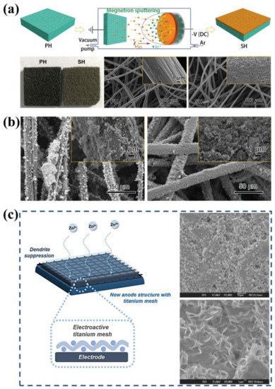 (a) Schematic diagram for the fabrication process of tin-modified electrodes, the morphologies of the pristine carbon felt (PH) and the tin-modified carbon felt (SH). (b) SEM images of the pristine carbon felt (left) and the tin-modified carbon felt (right) after charging. (Reproduced from [43] with permission from Wiley.) (c) Schematic diagram of the electrode with titanium mesh and SEM morphologies of the electrode with (top right) and without (bottom right) titanium mesh after initial Zn deposition. (Reproduced from [44] with permission from Nature).