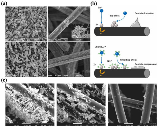 Metal cations with reduction potentials between the Zn2+ ion reduction potential and the hydrogen evolution potential can be used as additives to address the Zn dendrite issue [155]. They preferentially absorb on the tips without being reduced and form an electrostatic shielding layer impeding the continuous deposition of Zn2+ ions, thus suppressing the growth of Zn dendrites [156]. Based on this principle, Kim et al. demonstrate that adding Cr3+ can transform the deposited layers from needle-like dendrites to mirror-image films and shift the growth direction of Zn from the vertical to the horizontal plane (Figure 6b) [25]. As a result, the Coulombic efficiency of the ZFB increased from 89.8% to 91.3% after the addition of Cr3+ ions.