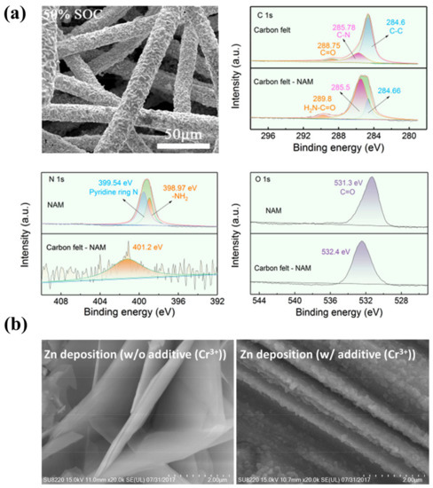 (a) The morphology of the Zn plated on carbon felts after the addition of NAM and the high-resolution XPS of the corresponding samples. (Reproduced from [48] with permission from American Chemical Society.) (b) Morphologies of Zn electrodeposited on graphite felts without Cr3+ (left) and with 0.1 M of Cr3+ (right). (Reproduced from [25] with permission from Elsevier).