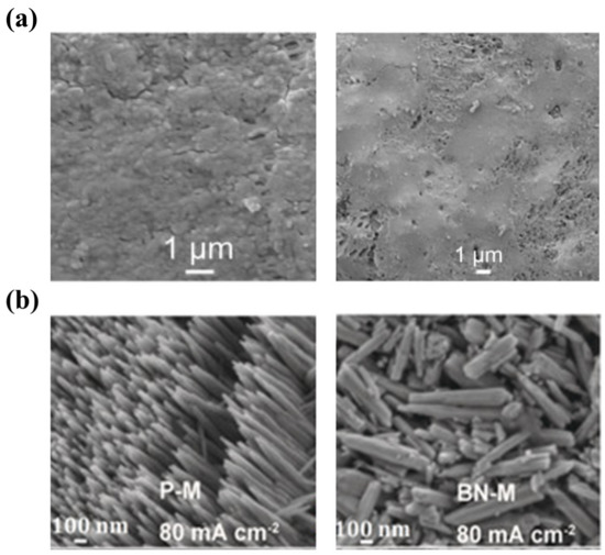 Compared with ion-exchange membranes, porous membranes can usually be fabricated at a lower cost. Moreover, they exhibit a higher ionic conductivity, which is conducive to high-power ZFBs. Hence, developing porous membranes with excellent dendrite suppression capability is of great significance for ZFBs. Several attempts have been made to achieve this objective [19,28,50,161,162,163]. Li et al. fabricated a novel composite membrane by coating polyethylene glycol (PEG) on the surface and pore walls of a porous polyolefin membrane [28]. The PEG coating as an ionic conductor promotes the uniform distribution of Zn2+ concentration. Meanwhile, the PEG coating also works as a passivation layer for Zn atoms, enabling a uniform electric field distribution on the negative electrode surface. As a consequence of the dual-functional design, uniform Zn deposition without obvious dendrites is achieved, as demonstrated in Figure 8a. In addition, the same group also developed a boron nitride nanosheet (BNNS)/porous poly (ether sulfone) (PES) composite membrane [50]. It is reported that BNNSs with high thermal conductivity function as a heat-porter to improve the temperature distribution on electrode surfaces, thus converting the deposited Zn from needle-like to French fries-like morphology, as shown in Figure 8b. Meanwhile, the high mechanical strength of BNNSs prevents the damage from the deposited Zn. As a result, an alkaline Zn-Fe flow battery assembled with the composite membrane is capable of running for 500 cycles at 80 mA cm−2. Although promising results in Zn dendrite suppression have been achieved via membrane engineering, research in this direction is still limited compared with electrode modification and electrolyte modulation. However, given the important role of membranes, more efforts should be devoted to developing advanced membranes to achieve high-performance ZFBs.