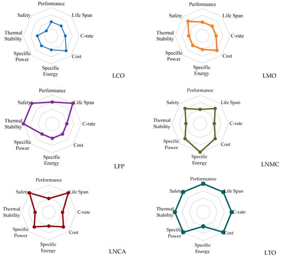 A detailed comparative study of lithium-ion battery materials, performance, and characteristics is shown in Figure 1 [52]. The figure clearly presents that LMO, LNMC, and LNCA batteries are the best depending upon the voltage, power, and energy categories. On the other hand, LFP and LTO batteries can be used when high lifecycle and safety are major concerns. Moreover, LTO is economically excellent and capable of delivering high performance.