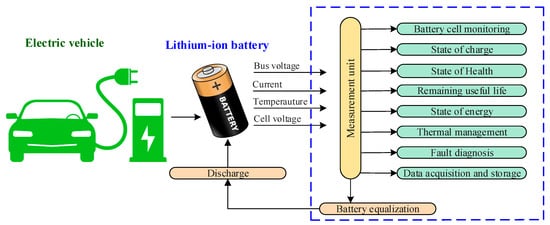 The information on battery charging/discharging, health, temperature, and fault diagnosis is the foundation for completing the BMS duties [70,71]. Generally, a pack of battery cells is used in EVs [72]. The battery cell may react differently during the battery charging/discharging operation. As a result, continual battery cell monitoring is required to investigate the different states and performance indices [52]. The findings of the battery cell monitoring can help the system function better by managing, protecting, balancing, and controlling operations [73].
