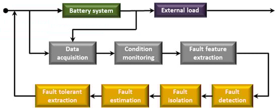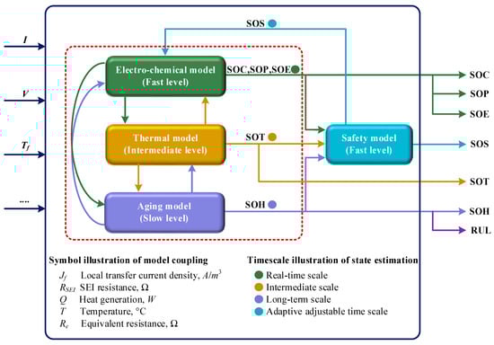 The battery state estimation is critical for estimating battery charge and health. The SOC, SOH, RUL, state of function (SOF), state of power (SOP), state of energy (SOE), and state of safety (SOS) are some of the common battery states [82]. A framework for estimating SOC, SOH, RUL, SOF, SOP, SOE, and SOS for the BMS is depicted in Figure 4 [83].