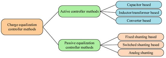 The BMS can protect the battery from abnormalities that are caused by the under/overcharging of the battery through individual cell monitoring and charge equalization control [106,107]. The undercharging of the battery can deteriorate the lifetime, and overcharging of the battery can damage it completely. To enhance and maintain the constant performance of the battery, the equalization of voltage and charge of battery cells is critical [108]. Battery equalizer control can be broadly categorized into active and passive charge equalization controllers, as shown in Figure 6 [109].