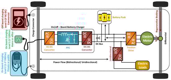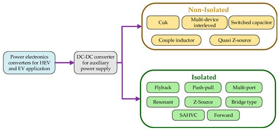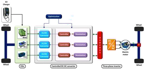 The management system of the battery storage system plays a crucial role in the EV system [16]. For proper supervision of energy storage devices for safe and healthy operation, various techniques and control operations such as cell monitoring, voltage, and current monitoring, data acquisition, charge–discharge control, power management control, temperature control, fault diagnosis, and network and communication network should work spontaneously [17,18,19]. In order to perform all the operations efficiently, a set of highly efficient power electronic devices are needed. DC/DC converters play a vital role in EV technology. The most widely used DC/DC converters are isolated and non-isolated. A non-isolated DC/DC converter such as Ćuk, switched capacitor, coupled inductor, and quasi Z-source converters are used for converting voltage up or down in a relatively low ratio [20,21]. Due to low cost, high efficiency, and lower ripples, DC/DC converters are famous in EV technology. However, present switching control techniques are not reliable enough for EVs. An isolated DC/DC converter is used when the ratio of output and input voltage is high. The buck–boost converter, push–pull converter (PPC), DC/DC resonant converter (RC), zero-voltage switching converter (ZVSC), and full-bridge boost DC/DC converter (FBC) are widely used converters in EV technology, with each having individual drawbacks.