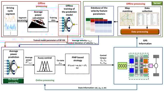 EV performance depends not only on energy storage but also on power and energy intelligent control strategies. In order to regulate power/energy flow efficiently in electric vehicles, the energy storage control system must be capable of dealing with high peak power when accelerating or decelerating [114]. Two basic types of common strategies are adopted for power and energy management (PEM) control [115]. A low-level component control strategy enhances the PEM performance and flexibility via a power transfer train mechanism that connects ESS, auxiliary ES, ICE, and generators altogether. A high-level supervisory control system works on the time-based data extraction process and balances the operations of different components. Various types of efficient PEMC systems have also been reported in several articles for HEV; among them, two major types are rule-based and optimization-based. The rule-based strategy can be classified into two types: deterministic rule-based and fuzzy logic. The real-time optimization and global optimization PEMC systems are types of optimization-based PEMC systems [22,116,117]. Based on the driving schedule, the powertrain model, and two neural networks, the energy management strategy based on the deep Q-learning method for a hybrid EV was proposed by Du et al., as shown in Figure 9 [118].