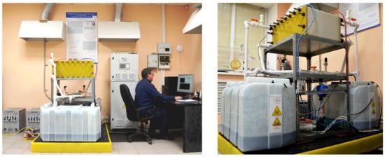 Two test benches (6 kWh and 30 kWh) were developed to test the operating modes of the VRB stack [23]. These benches differed in the volume of electrolyte tanks used, with 2 × 200 L for a 6 kWh bench and 2 × 1000 L for a 30 kWh bench. A photo of the 6 kWh bench is shown in Figure 2, and its hydrodynamic system is shown in Figure 3. The hydraulic system of benches consisted of 2 tanks with electrolyte, 2 frequency-driven pumps for pumping electrolyte, a balancing pump and flow, pressure and temperature sensors in each circuit.