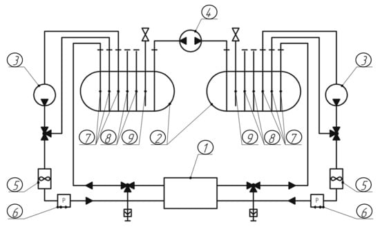 Hydrodynamic scheme of the VRB test bench: 1—VRB stack; 2—tanks with electrolyte; 3—main pumps for pumping electrolyte; 4—balancing pump; 5—electrolyte flow sensors; 6—pressure sensors; 7—outlet pipes; 8—branch pipes with an outlet in the form of a fitting; 9—branch pipes with pressure relief valves.