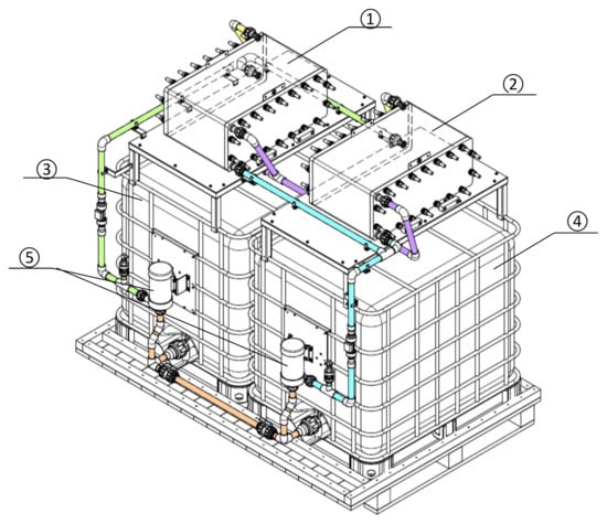 Scheme of a test bench with two flow stacks: 1, 2—VRB stack; 3—positive electrolyte tank; 4—negative electrolyte tank; 5—pumps.