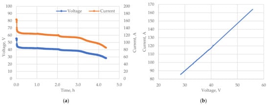 Figure 5 shows the discharge characteristics of the flow stack as well as its I-V characteristics obtained on a test bench. The load current was changed during the discharge phase to build the current–voltage characteristic of the stack. This characteristic is important for tuning the power converters and algorithms of the RFB control system.