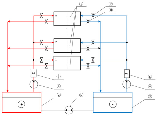Hydrodynamic scheme for connecting multiple flow stacks: 1—VRB stack (n pieces); 2 and 3—electrolyte tanks; 4—main electrolyte pumps; 5—balancing pump; 6—electrolyte flow sensors; 7—input valves; 8—outlet valves.