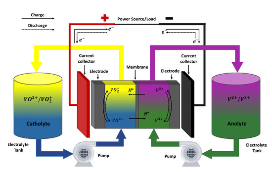 The amount of energy stored in the system is directly related to the volume of electrolyte in the tanks and the concentration of the vanadium “charged species” ( and ). Evidently, charged species concentrations will increase during charge operation and decrease during discharge. Due to limitations in the vanadium solubility, the total vanadium concentration in each electrolyte rarely exceeds 2 M [50].