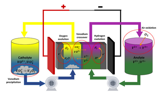 - Air oxidation. When the negative electrolyte tank is exposed to the atmosphere, oxygen present in the air tends to dissolve in the liquid and produce the oxidation of to [61].Consequently, in order to prevent this phenomenon, it is essential to keep the negative electrolyte tank isolated from the atmosphere. This protection can be also attained by periodically purging the electrolyte with an inert gas, such as nitrogen [62].
