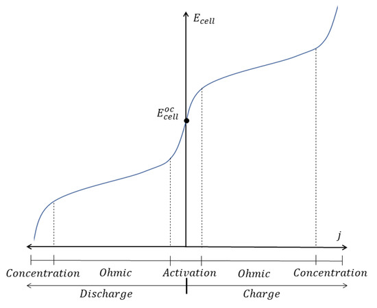 The cell voltage () of an electrochemical cell can be calculated as the sum of an open circuit voltage (OCV) and a series of overpotentials, which represent the deviation with respect to the OCV originated by the passage of electric current [93,94] (see Equation (38)). Evidently, the effect of the overpotentials will be to reduce the when the battery operates in discharge mode, and increase it when charging. This means that the voltage required to charge the battery will be higher than the voltage that provides the battery in discharge, consequently reducing the energy efficiency of the VRFB.