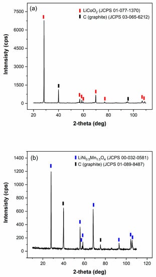In general, LIBs consist of a cathode, an anode, and a polymeric separator impregnated with an electrolyte that enables the ionic conduction of lithium ions. The active material used in the cathode can vary depending on the manufacturer [3]. The most common compounds of the cathode material are LiCoO2, LiMn2O4, and LiFePO4, among others [5]. On the other hand, the active material commonly used in the anode is graphite [6,7].