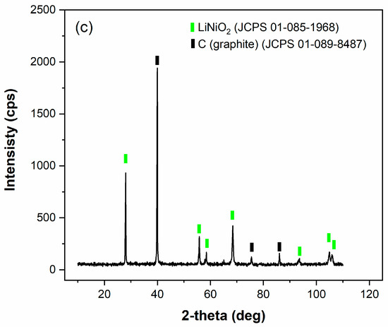 Diffractograms of the black mass samples from spent LIBs: (a) SBM, (b) VBM-1, and (c) VBM-2.