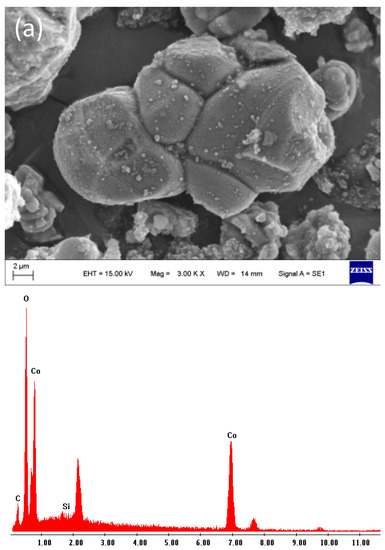 The XRD patterns for SBM, VBM-1, and VBM-2 are shown in Figure 1. Diffraction maxima were found that can be attributed to the phases of LiCoO2 for SBM, LiNi0.5Mn1.5O4 for VM-1, and, to a lesser extent, LiNiO2 for VM-2. Several reflection maxima corresponding to the carbon graphite phase were detected in the three samples SBM, VBM-1, and VBM-2. Thus, the high carbon content in black mass samples is related to crystalline carbon graphite. This result agrees well with the chemical composition of the initial samples. Figure 2 shows SEM micrographs and EDS spectra from particles of each black mass sample. VBM-1 and VBM-2 samples are made up of agglomerates of rounded primary particles. The micrograph of the SBM sample exhibits particles without a regular form having a smooth surface and sharp edges. Regarding the EDS results, the elements detected are as follows: C, O, Ni, Al, Mn, and Co in VBM-1; C, O, Al, Co, and Ni in VBM-2; and C, O, Co, and Si in SBM.