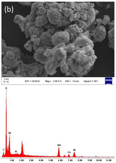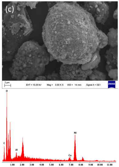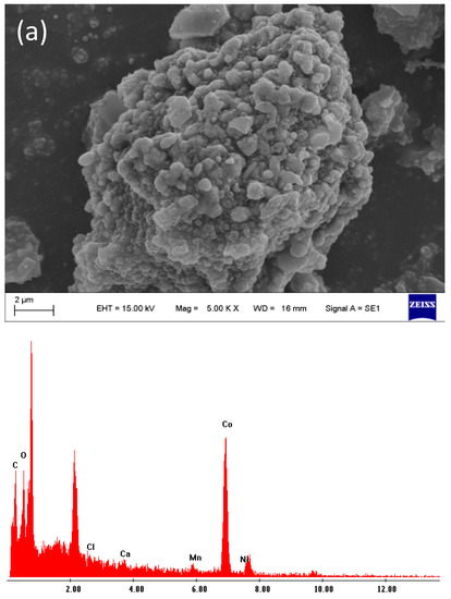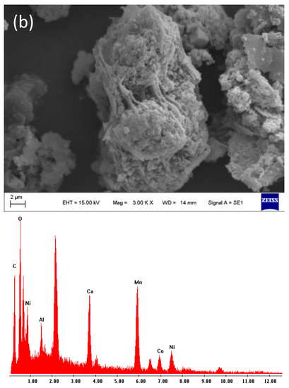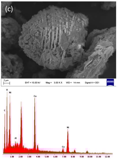 Figure 5 exhibits the SEM micrographs and EDS spectra of NSP samples from the calcination of the BM/CaCl2/CB sample at 700 °C. If we draw a comparison with the SEM micrographs from Figure 2, we can infer that the samples are attacked because they have very different morphology after the heat treatment. Regarding EDS results, the elements detected are as follows: C, O, Ni, Al, Ca, Mn, and Co in VBM-1; C, O, Ni, Al, Ca, and Co in VBM-2; and C, O, Ca, Mn, Co, and Ni in SBM. Considering the XRD results, the detection of Ca by EDS in the three NSP samples can be associated with the CaCO3 phase.