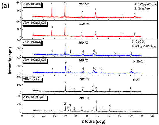 Figure 4 shows the XRD patterns of the NSP samples obtained after each isothermal calcination of both mixtures BM/CaCl2 and BM/CaCl2/CB. Figure 4a–c show the results of VBM-1, VBM-2, and SBM, respectively. Regarding VBM-1, at 350 °C, the peaks of the LiNi0.5Mn1.5O4 phase found in the original sample are still present in the XRD pattern of the NSP sample. At 500 °C, the peak intensity of the LiMn0.5Ni1.5O2 phase decreases significantly, but the decrease is more noticeable in the case of the VBM-1/CaCl2/CB system. We can infer that at 500 °C, LiMn0.5Ni1.5O2 starts to react with CaCl2, and the reaction is favored when CB is present because peaks of CaCO3 and mixed Ni and Mn oxide start to become noticeable. At 700 °C, the LiMn0.5Ni1.5O2 is no longer detected in either case. In the case of the VBM-1/CaCl2 system, peaks characteristic of mixed Ni and Mn oxide and CaCO3 are predominantly observed. In the case of the VBM-1/CaCl2/CB system, very intense peaks corresponding to metallic Ni can be observed. Peaks of CaCO3 and MnO2 are also identified as reaction products.