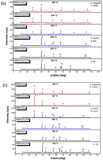 With respect to VBM-2, at 350 °C, the peaks of the LiNiO2 phase found in the original sample are also identified in the NSP sample for both systems VBM-2/CaCl2 and VBM-2/CaCl2/CB. At 500 °C, the peak intensities of the LiNiO2 phase decrease drastically for the VBM-2/CaCl2. In the case of the VBM-2/CaCl2/CB system, the phase LiNiO2 is no longer detected; instead, NiO and CaCO3 are detected as reaction products. Therefore, we can infer that at 500 °C, LiNiO2 starts to react with CaCl2. When the temperature is increased to 700 °C, NiO and CaCO3 are the reaction products for the VBM-2/CaCl2 system. Whereas metallic Ni, CaCO3, and NiO are identified as reaction products for the VBM-2/CaCl2/CB system. The peaks of the NiO phase are largely reduced in intensity.