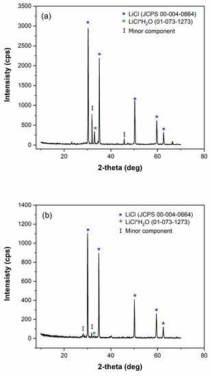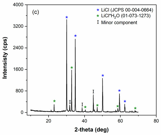 Figure 6 shows the XRD patterns of the SP samples obtained after the isothermal experiment performed at 700 °C for the BM/CaCl2/CB system. Figure 4a–c show the results of SBM, VBM-1, and VBM-2, respectively. All patterns exhibit characteristic diffraction maxima of LiCl and hydrated LiCl. Minor characteristic peaks of LiF were also detected; this result can be attributed to possible impurities associated with traces of electrolyte that may have still been present in the original black mass sample. The presence of LiF could also be due to the formation of a solid electrolyte interface (SEI) during the lithiation/delithiation process (i.e., lithium intercalation process).
