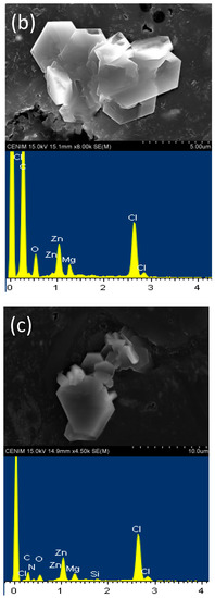 Figure 7 presents the SEM micrographs of the SP samples. The particles of the three samples have a microscopic structure with a high degree of crystallization, agglomeration, and approximate laminated morphology with a smooth surface and a hexagonal shape. Elemental analysis shows the presence of Cl. These results confirm that LiCl is predominantly present in the SP samples. Therefore, lithium is extracted selectively as LiCl from each black mass sample by the process of carbochlorination with CaCl2. Other elements are detected in SP samples by EDS; they are impurities that originated during sample preparation.