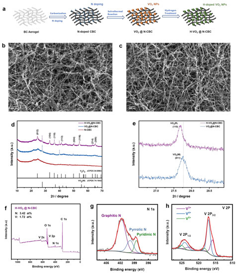 (a) Schematic illustration of the overall synthesis procedure of H-VO2@N-CBC; SEM images of (b) VO2@N-CBC and (c) H-VO2@N-CBC; (d) XRD pattern of H-VO2@N-CBC, VO2@N-CBC, and N-CBC, and (e) a magnified region of the XRD data in 26° ≤ 2θ ≤ 29°; (f) XPS broad survey and high-resolution (g) N 1 s and (h) V 2 p spectra of H-VO2@N-CBC.
