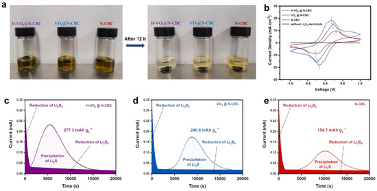 (a) Photos of H-VO2@N-CBC, VO2@N-CBC, and N-CBC initially added in 5 mM Li2S6 solution and after aging for 12 h; (b) cyclic voltammetry (CV) curves of Li2S6 symmetric cells with H-VO2@N-CBC, VO2@N-CBC, and N-CBC electrodes at a scan rate of 10 mV/s; Li2S precipitation process of (c) H-VO2@N-CBC, (d) VO2@N-CBC, and (e) N-CBC under potentiostatic discharge conditions.