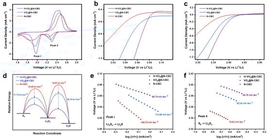 (a) Cyclic voltammetry (CV) profiles of the Li-S cells with H-VO2@N-CBC-, VO2@N-CBC- and N-CBC-based cathodes at a scan rate of 0.2 mV/s with the voltage range of 1.6~2.8 V; (b,c) linear sweep voltammetry (LSV) curves obtained from Figure 3a near Peak I and Peak II; (d) relative activation energy difference among three electrodes depending on a reaction coordinate; (e,f) the corresponding Tafel plot derived from the LSV curves in Figure 3b,c for Peak I and Peak II.