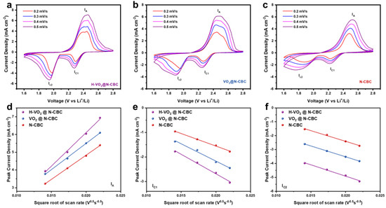 Cyclic voltammetry (CV) profiles of Li-S full cells with (a) H-VO2@N-CBC, (b) VO2@N-CBC, and (c) N-CBC obtained at scan rates from 0.2 to 0.5 mV/s; (d–f) peak current density (Ip) versus square root of scan rates (ν0.5) with three different electrodes at redox peak A, C1, and C2.