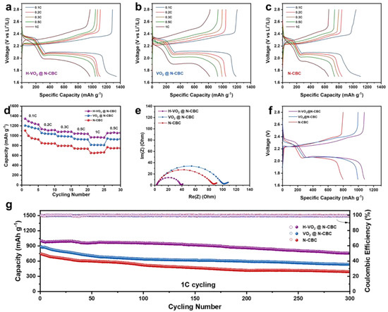 Galvanostatic charge/discharge profiles of (a) H-VO2@N-CBC-, (b) VO2@N-CBC-, and (c) N-CBC-based cathodes at current rates of 0.1, 0.2, 0.3, 0.5, and 1 C; (d) rate performance comparison from 0.1 to 1 C and (e) EIS curves comparison; (f) charge/discharge voltage profile comparison at 0.3 C; (g) long-term cycling stability comparison at 1 C.
