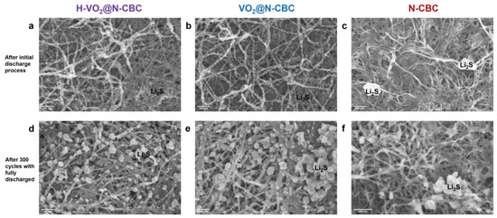 To observe the catalyst stability, the cells after 300 charge/discharge cycles were disassembled at the fully discharged status. The S-cathode morphology was observed using SEM imaging. With the assistance of H-VO2 (Figure 6a,b) and VO2 (Figure 6c,d) NP catalysts, the precipitation of Li2S was regulated, and fine Li2S particles were uniformly deposited along the surface of the carbon nanofibers. In contrast, without oxide catalysts, bulky Li2S clusters (Figure 6c,f) are found in the N-CBC matrix. After 300 cycles, although some Li2S agglomerations were observed in the H-VO2@N-CBC- and VO2@N-CBC-based sulfur electrodes, the Li2S reduction products were still firmly immobilized and well-dispersed on the carbon nanofibers, which suggests that the active VO2 and H-VO2 NPs were retained on the carbon nanofibers and verified the catalysts’ stability during battery cycling. It is worth noting that some Li2S clusters were formed in VO2@N-CBC in Figure 6e that were not observed in the H-VO2@N-CBC matrix. Therefore, H-VO2 NPs provide a better catalytic ability for converting LiPSs and regulating Li2S deposition than VO2 NPs.