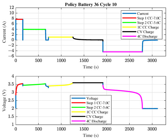 Figure 1 shows an example of the charging and discharging cycles for battery 36, which has a 7C-30PER_3_6C policy. Considering the string defining the policy, the cycle is characterized by a first step current at 7C up to 30% SoC and a second step current at 3.6C up to 80% SoC. In the case of policies with a single fast charging step, is set equal to , and %. Figure 2 shows a typical cycle for battery #1, which is characterized by a single fast charging step of 3.6C up to 80% SoC (3_6C-80PER_3_6C).