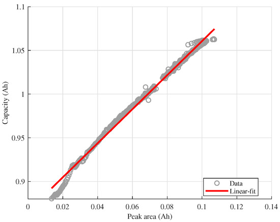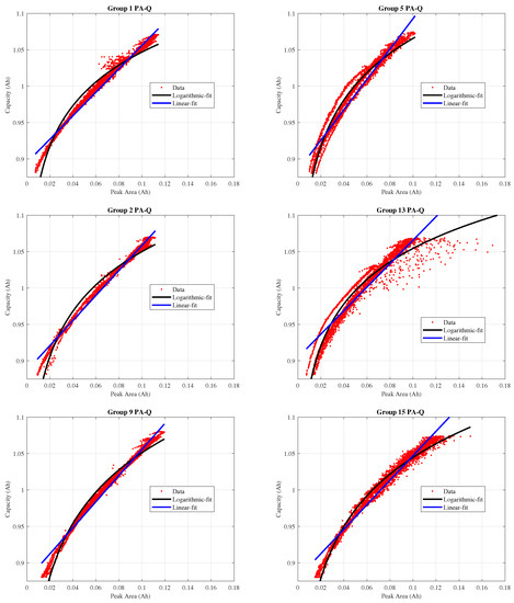 The procedure described in Section 3 is applied to all the available cycles for the 89 batteries. It is worth mentioning that some cycles are affected by errors in the acquisition, such as missing portions of data, and were not processed for IC curve extraction in order to avoid unnecessary outlier points. After the removal of the irregular cycles, the discharge capacity Q of the battery, computed in the 4C-discharge phase, can be related, cycle by cycle for each battery, to the IC peak area . It is worth noting that the computation of Q through a 4C CC discharge current, which is the only one available in all tests, leads to lower capacity values than those expected using typical characterization currents, such as 1C or C/20. Nevertheless, despite the underestimation, we expect that the conclusions obtained for this scenario, regarding the relation, hold for typical characterization cases.