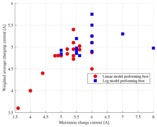 The points in the plot in Figure 6 represent the batteries with a difference over 1% between the values for the linear and logarithmic models, with the circles corresponding to batteries better represented by the linear model and the squares the batteries with higher for the logarithmic model. The distribution of the points in the plain highlights that batteries with lower maximum and average currents can be better represented using a linear relationship, while for the cases with higher maximum currents, the non-linearity of the capacity fading leads to a relation better represented by the logarithmic model.