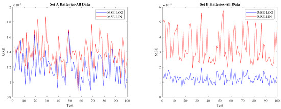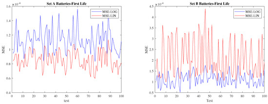 We implemented the aforementioned scenario by dividing both Set A and Set B into two parts each. The first part, employed as a training set, is used to estimate the coefficients for the linear and logarithmic models using ordinary least squares. The other part of the set is used for the evaluation of the prediction performance in terms of Mean Squared Error (MSE). We take into consideration that each set contains multiple groups of batteries, containing from three to eight batteries each. Therefore, the data split focuses on each group. For each group in each set, 70% of the batteries are randomly selected, and their data are added to the training set. Conversely, the data of the remaining batteries are added to the test set.