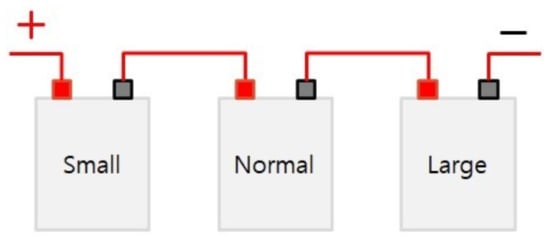 When batteries of different capacities are connected in series to charge and discharge, a single current loop is formed for all cells, and the same current flows. Additionally, the state of charge is different for each battery [3,4].