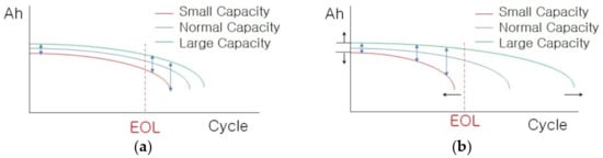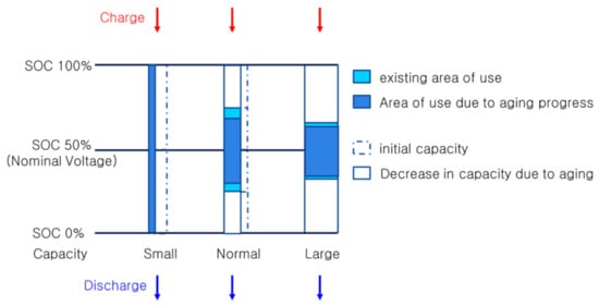 A battery with a relatively small capacity forms charging conditions with a relatively high voltage and accelerated C-rate aging, and a large-capacity battery forms charging conditions with a relatively low voltage and slow current aging. As the battery is repeatedly charged and discharged, the difference in battery capacity increases [17]. As is shown in Figure 2, when batteries of different capacities are connected in series and charged with one power source, a battery with a small capacity uses the full SOC, whereas a battery with a large capacity uses a small portion of the SOC [19]. A battery with a relatively large capacity has a narrow SOC range; thus, the aging process is slower than that of a battery with a relatively small capacity.