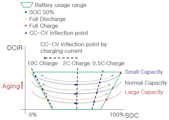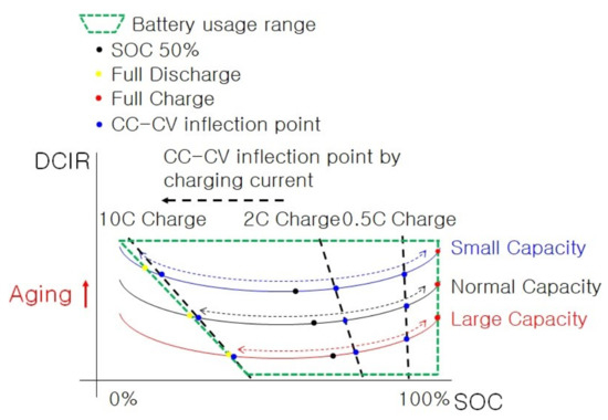 In Figure 3, it can be seen that, when charging and discharging assembled series-connected batteries at a nominal voltage from an SOC of 50%, looking at the area of the green dotted line in Figure 3, the usage range of the battery SOC with a relatively small capacity is relatively large. Smaller-capacity batteries inherently have higher internal resistance [7,19]. Conversely, a relatively large-capacity battery has a small usable area and low internal resistance. In Figure 3, predicting the internal resistance when the CC-CV inflection point is reached during charging can be expressed as points on the 10 C charge, 2 C charge, and 0.5 C charge lines. In the case of 2 C charging, since only the DCIR deviation of the Y-axis is obtained, the deviation of the internal resistance is the shortest. However, in the case of 10 C and 0.5 C charging, the deviation of the internal resistance becomes larger because it has both the X-axis and the Y-axis DCIR deviation values.
