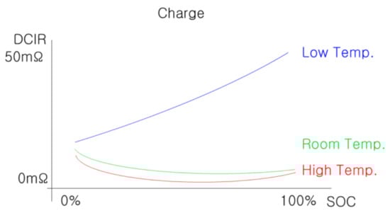 Figure 4 shows the DCIR temperature characteristics of a pouch-type lithium polymer battery. Lithium polymer batteries have relatively high DCIR values at close to 100% SOC and low temperatures [22]. Therefore, a large stray voltage is generated by the current during charging; thus, less than the actual capacity is charged. Conversely, at high temperatures, the DCIR value is relatively low, resulting in charging beyond the actual capacity.