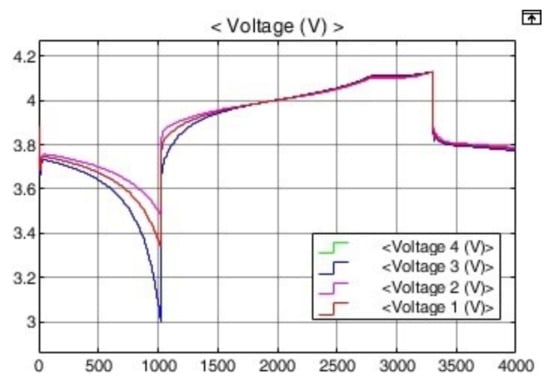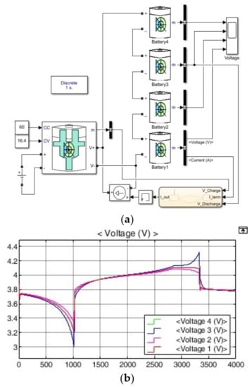Simulations were performed with Simulink in Matlab 2009a for illustrative purposes. For the charger and battery, the CCCV battery charger provided by Simulink and the lithium-ion type library of battery were used (see Figure 6). In Figure 6a, battery 1, battery 2, battery 3, and battery 4 are 40, 38, 42, and 40 Ah, respectively, and the initial SOC was set to 50%. The 38 Ah cell was discharged at 1.5C (60 A) until it reached 3.0 V. Then, it was charged at 16.4 V/60 A (1.5 C), which is rapid charging, and terminated at ½ C (20 A) [7]. Batteries are delivered with nominal voltage and with capacity deviations from the production process. Figure 6b is the simulation result assuming serial connection assembly with batteries delivered. When the SOC is below 50%, it can be seen that the voltage of cells with relatively small battery capacities is lower than that of others [7,8,10,18,25,26,27]. In this case, when passive cell balancing was performed, the voltage of the large-capacity cell was lowered. Conversely, when the SOC is 50% or higher, the voltage increase rate of the small-capacity cell is high and the voltage of the relatively large-capacity cell is low [7,10,11,12,18]. Therefore, at an SOC of 50% or higher, cells with relatively small capacities are passively balanced. From the simulation results in Figure 6b, it was confirmed that balancing the cell with only the potential difference is meaningless.
