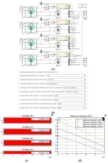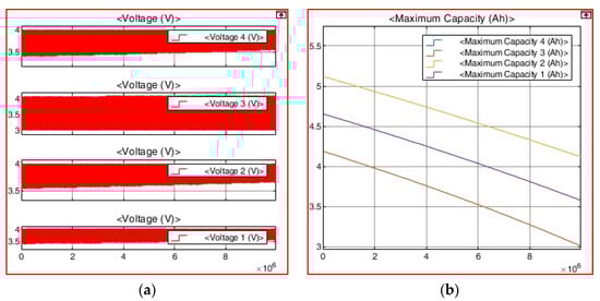 We set the capacities of batteries 1, 2, 3, and 4 to 4.5, 4.05, 4.95, and 4.5 Ah, respectively, which are ±10% deviations from the central capacity, but the cell balancing target was shifted from 50% SOC in Figure 3 to 100% SOC, as shown in Figure 10. The initial states of charge of batteries 1, 2, 3, and 4 were set to 55% (2.475 Ah), 50% (2.025 Ah), 59.09% (2.905 Ah), and 55% (2.475 Ah), respectively, and, when charging was complete, all SOCs were 100%. All cells were set to arrive at the same time. Battery aging and voltage changes were confirmed by repeating charging and discharging under the same conditions as for the simulation in Figure 9. In Figure 13a, the voltage result of each cell is shown. The results of battery capacity changes are in Figure 13b. For Figure 8, Figure 9 and Figure 10 and Figure 14, the simulation time was the same, and Table 7 summarizes the simulation results of Figure 13.