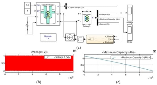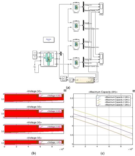 In the simulation in Figure 7a, a lithium-ion battery from Matlab's Simulink library was used. The charger used the CCCV battery changer library provided by Simulink. The maximum capacity deviation of each battery is ±5%. In the case of the charger, each battery was charged and discharged with a current of 1 C in proportion to its capacity. As is shown in Figure 7b, the life cycles of all batteries were set to be the same. The simulation results in Figure 7c show that each cell was stably charged up to a charging voltage of 4 V and was uniformly discharged to 3 V for 1 × 107 seconds.