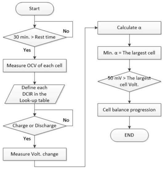 As shown in Figure 10, all cells reached SOC 100% at the time of completion of charging so that the DCIR deviation had only Y-axis values. At the beginning of shipment, the capacity deviation of the battery was checked and managed so that the aging process at the initial stage of shipment did not proceed quickly, and the capacity deviation was reduced at full charge by repeating charging and discharging. At a relatively low voltage, the DCIR value increases due to the capacity deviation, and the potential difference at the CC–CV inflection point increases during ultrafast charging, but the problem can be solved with the MLMCC–CV charging method proposed in a previous paper [33]. Figure 11 shows the flowchart of the proposed cell balancing method. In a battery connected in series, the cell with the largest capacity is selected. If cell balancing is performed only when the voltage of this cell is relatively high, repeated charging and discharging moves the cell balance reference point; compare Figure 3 and Figure 10.