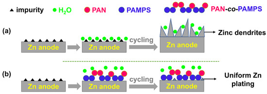 Schematic illustration of the Zn-stabilizing mechanism of PAN-co-PAMPS. Molecule distribution at the surface of Zn anode of Zn|Zn symmetric cell using (a) pristine and (b) additive-containing electrolyte.