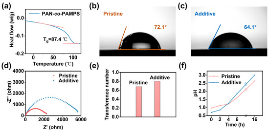 Physicochemical properties of electrolyte. (a) DSC of PAN-co-PAMPS. (b,c) Contact angles between pristine electrolyte and additive-containing electrolyte at 5 min. (d) Charge transfer resistance of Zn|Zn symmetric cell with pristine electrolyte and additive-containing electrolyte. (e) Transference number of Zn|Zn symmetric cells with pristine electrolyte and additive-containing electrolyte. (f) pH value changes of pristine and additive-containing electrolyte with soaked Zn metal.
