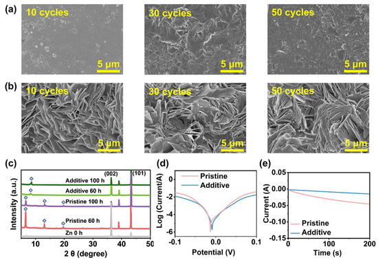 Figure 4a,b show the SEM morphology of a Zn electrode with an additive-containing electrolyte and a pristine electrolyte at 1 mA cm−2 for 10, 30, 50 cycles, respectively. The surface of a Zn electrode with an additive-containing electrolyte is smooth with some etch, but the surface of a Zn anode with a pristine electrolyte is full of zinc dendrites. This is an intuitive description of the effect of the additive. PAMPS acts with Zn to remove impurities and oxides on the surface, but does not destroy the Zn anode. The water-poor environment formed by PAN prevents dendrite growth. In contrast, the severe growth of dendrite on the surface of a cell with a pristine electrolyte may be the main cause of cell failure. Figure 4c further shows that cells with an additive-containing electrolyte produce less by-product during cycling. After cycling for 100 h, the peak of the by-product shown with a rhombus is much higher than cells with an additive-containing electrolyte. By-products lower the ion transport rate and consume more electrolytes, which reduce the life of the cell. Figure 4d,e shows the corrosion tendency of Zn|Zn cells. Figure 4d shows the Tafel curves of Zn with an additive-containing electrolyte and a pristine electrolyte. The corrosion potential of Zn with an additive-containing electrolyte is −0.009 V, higher than Zn with a pristine electrolyte (−0.014 V), with the corrosion current reducing from −2.212 mA cm−2 to −2.858 mA cm−2. This indicates that Zn with an additive-containing electrolyte tends to be much harder to corrode than Zn with a pristine electrolyte. Figure 4e shows the Chronoamperometry (CA) curves of Zn with an additive-containing electrolyte and a pristine electrolyte. For the cell with a pristine electrolyte, the current decreases hastily in 200 s, indicating that the zinc dendrites grow in two dimensions in the cell, which results in short circuiting. However, for the cell with an additive-containing electrolyte, the curve tends to be stable, which indicates 3D diffusion.