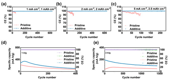 Electrochemical performance of Zn|Cu asymmetric cells and Zn|V2O5 full batteries. (a–c) Zn|Cu asymmetric cells using pristine electrolyte and additive-containing electrolyte when the current density is 1 mA cm−2, 2 mA cm−2, and 5 mA cm−2. (d,e) Zn|V2O5 full batteries with pristine electrolyte and additive-containing electrolyte when the current density is 1 mA cm−2 and 2 mA cm−2.