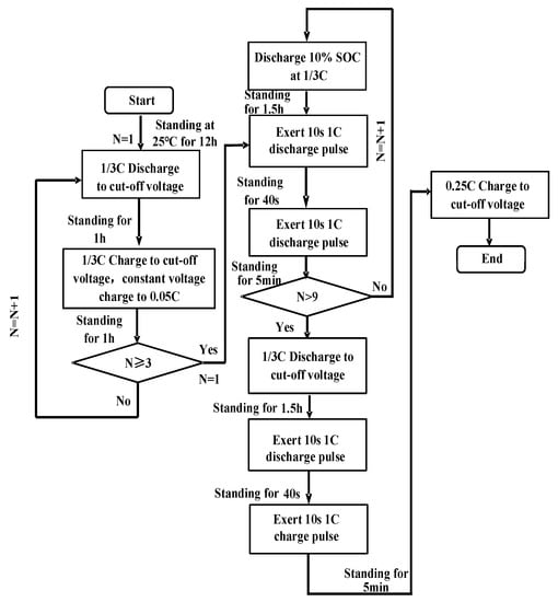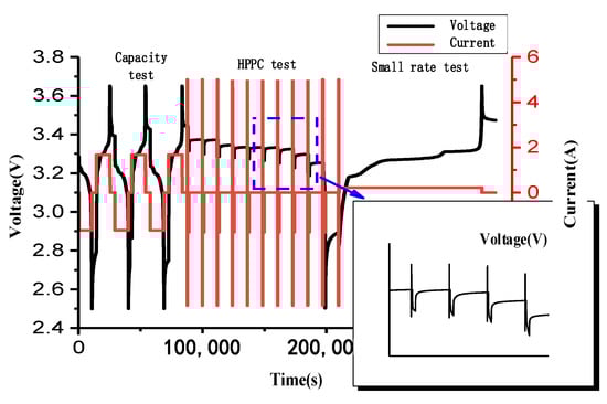 To study the changes in the battery capacity and other properties with different aging paths, the battery performances prior to and after cycling were compared. The battery capacity referred to herein is the discharge capacity of the battery. This required the determination of the initial performance parameters of the batteries, which included the internal resistance, OCV, SOC, and the relationship among these parameters []. To assess the basic performance of the batteries, capacity, hybrid pulse power characterization (HPPC), and small-rate tests were performed at room temperature (25 °C). During the capacity test, three charge–discharge cycles were performed at a charging rate of 1/3 C, and the discharge capacity of the last cycle was defined as the initial battery capacity. Next, the HPPC test was conducted on a fully charged battery to determine the battery impedance for the full SOC interval (0–100% SOC). For the small-rate test, a discharged battery was charged at a rate of 0.25 C and a constant current. This process has very minimal polarization; therefore, it can be used to detect small and gradual changes in the electrochemical characteristics of lithium-ion batteries [,]. Figure 2 and Figure 3 show the flowchart and voltage–current curve, respectively, of the basic performance tests.